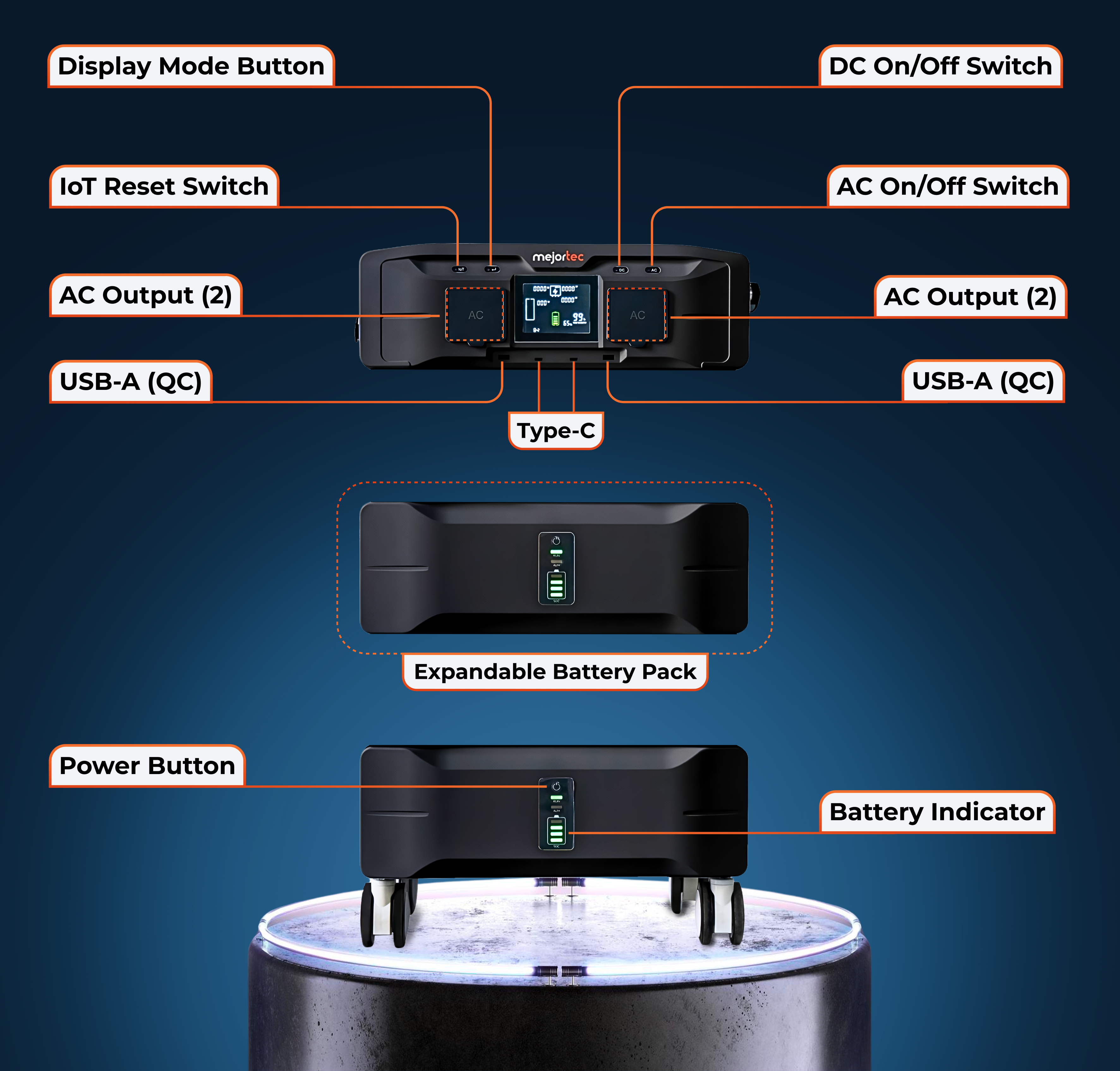 With a variety of versatile ports, the MejorTec SP 5000 (5120Wh) ensures you're always ready to power your devices. Whether it's laptops, smartphones, or small appliances, you have all the connections you need to keep everything running smoothly, anytime, anywhere.